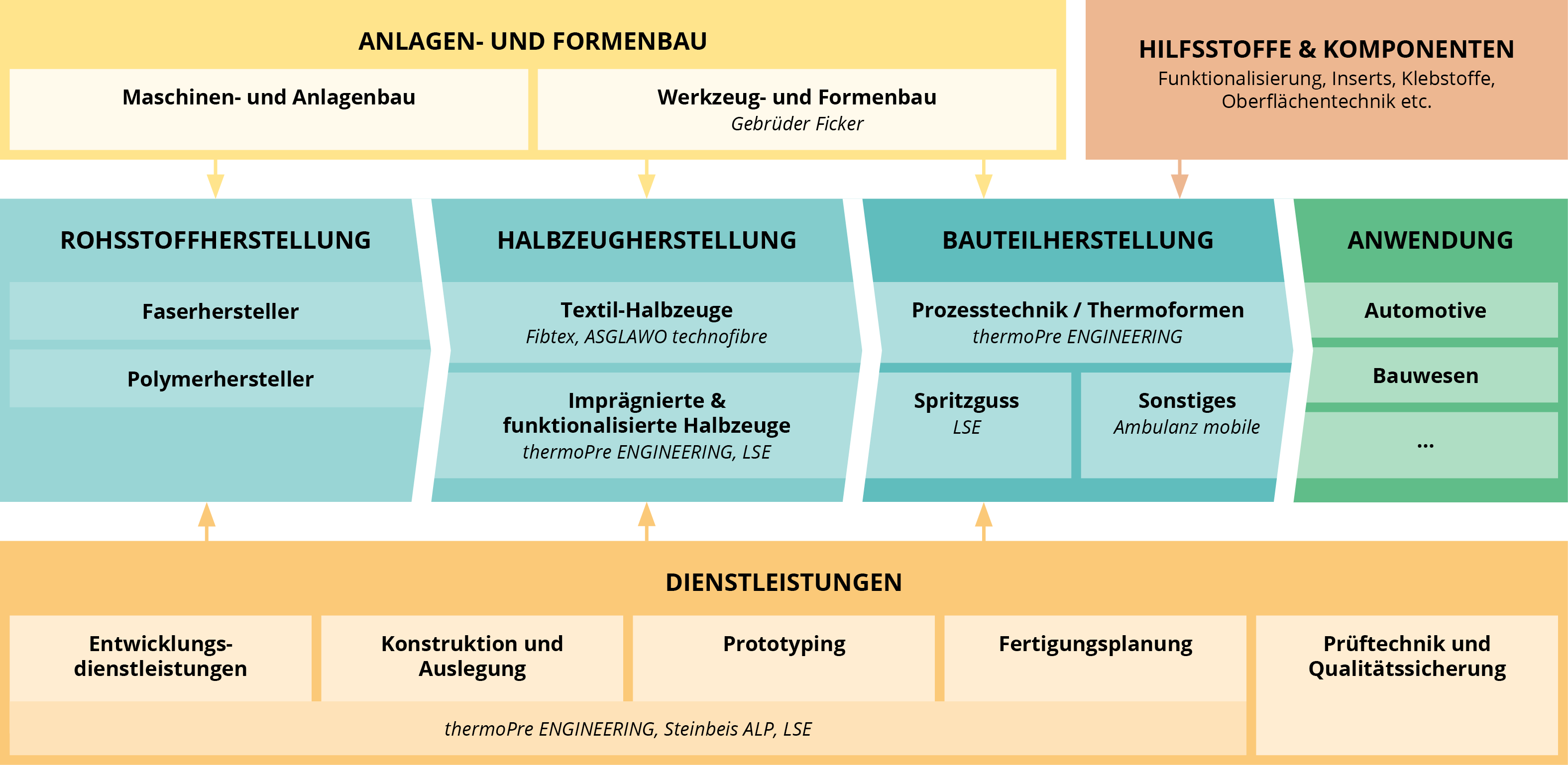 Wir bringen über die gesamte FKV-Wertschöpfungskette Hersteller, Dienstleister und Anwender zusammen. Gemeinsam schaffen wir ein Bewusstsein und eine Sensibilität für den übergreifenden Nutzen eines standardisierten Vorgehens. Wir ermöglichen den Netzwerkpartnern einen intensiven Einblick in die Voraussetzungen und Herausforderungen der anderen Wertschöpfungsstufen von der Faser bis zum Bauteil. Unsere Plattform bietet einen regen Kontakt und fachlichen Austausch auch über die direkt tangierenden Wertschöpfungsstufen eines jeden Partners hinausgehend.