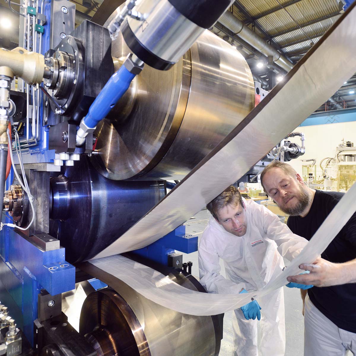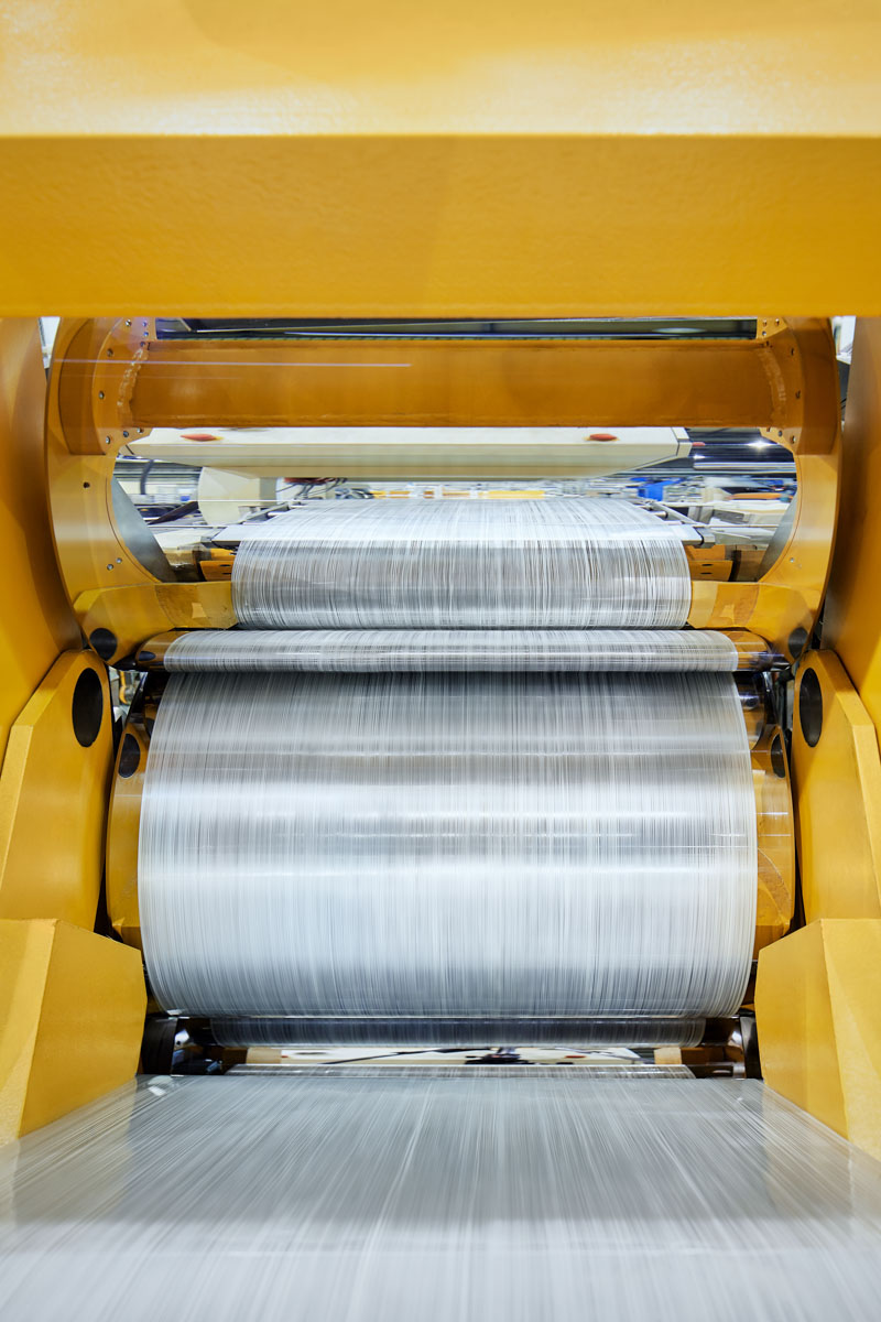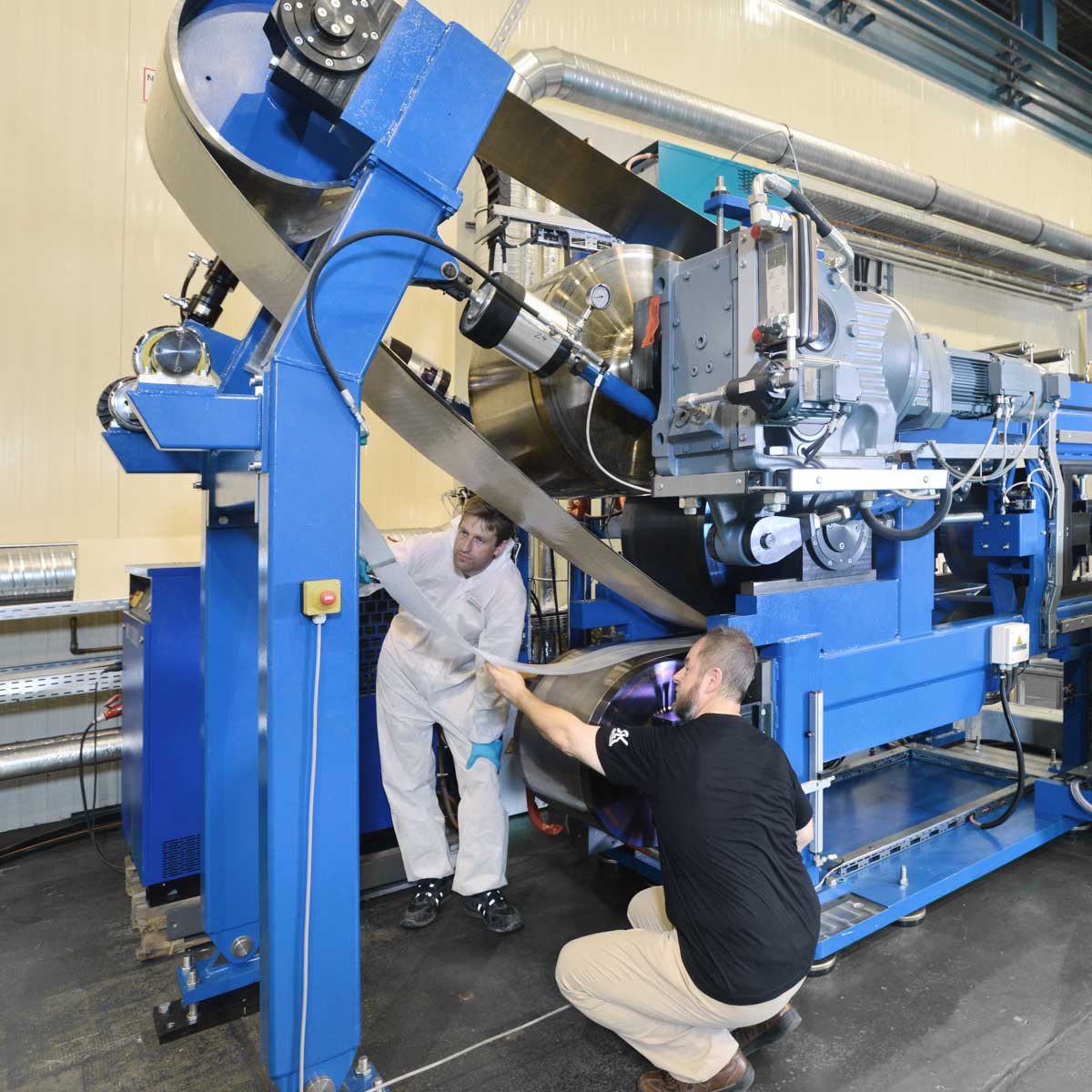 Außerdem kann der OMEGA-Imprägnierkalander auch als Stand-alone-Modul betrieben werden. Diese Konfiguration bezieht sich auf die Verarbeitung von hybriden textilen Flächengebilden, d. h. wenn die thermoplastische Matrix bereits Bestandteil der textilen Verstärkungsstruktur ist.